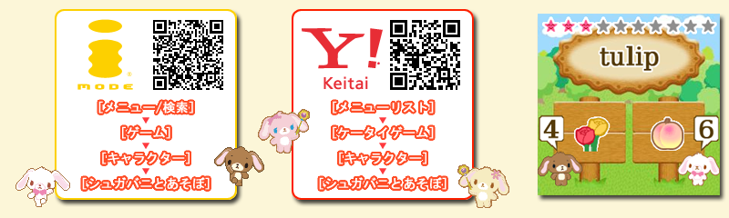 | アクセス方法 | ドコモ | [メニュー/検索] > [ゲーム] > [キャラクター] > [シュガバニとあそぼ] |